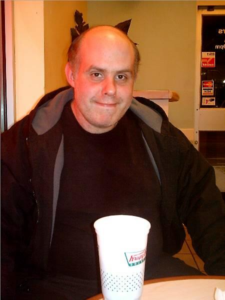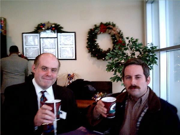 Imbibing some caffeine at "Holy Grounds" coffee shop, 2004